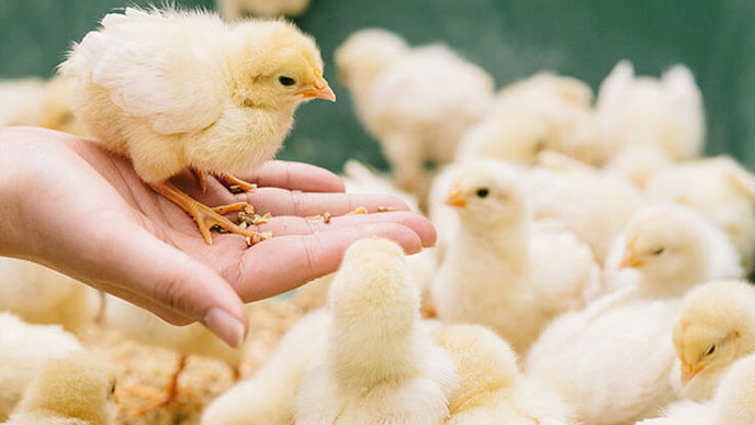 ヒナを健康に育てるために、入雛3日前から鶏舎を暖めはじめ、母鶏のおなかのように快適で過ごしやすい環境を作ってあげます。鶏舎内はコンピューターで制御されていますが、手で触れ、耳を澄まして、最適な環境になるように人間の五感も使ってヒナたちを見守ります。生後42日を過ぎると、ヒナたちは鶏に近い姿になり育成舎に移ります。